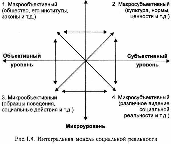 Несмотря на многочисленные попытки социологов, до сих пор не удалось создать единой общей социологической теории. Многие исследователи считают социологию мультипарадигмальной наукой, в которой сосуществуют различные парадигмы. Так, американский социолог Д. Ритцер разработал интегральную модель социальной реальности. Она представлена в виде взаимодействия четырех уровней социальной реальности: макрообъективного, макросубъективного, микрообъективного и микросубъективного (рис. 1.4).