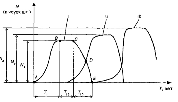 Воспроизводство отдельных видов товаров можно описать при наличии данных о структуре их жизненного цикла и сменяемости выпускаемой, проектируемой и перспективной моделей товаров. Воспроизводство товара по разным его моделям лучше всего описывать динамикой масштаба производства (рис. 1.5).