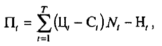 Т— прогнозная продолжительность выпуска товара, лет; Ц — прогнозная цена товара в году /на конкретном рынке; С — прогнозные издержки по выпуску товара в году t \ N — прогнозная годовая программа выпуска товара в году г, Н,— прогнозные налоги и отчисления (все виды) в году t по данному товару.