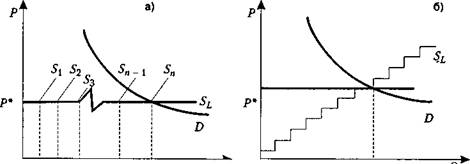 Каждая из долгосрочных кривых предложения соответствует определенному количеству фирм, чьи кривые средних издержек достигают минимума при объ еме выпуска q . По соседству с рыночным равновесием цена будет слегка выше Р*, как если бы существовало только п 1 производителей. При этой слегка более высокой цене каждый производитель зарабатывает маленькую экономическую прибыль, которая привлекает еще одну фирму на рынок. В результате выпуск от расли возрастает до nq , вынуждая цену вновь упасть до Р*, где все п фирм получают нормальную прибыль. Долгосрочная кривая предложения ( S L ) является го ризонтальной линией, даже если краткосрочные кривые предложения ( S , S , ...) наклонны.