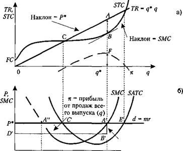 Мощности ограничены, и фирмы действуют в рамках краткосрочных предельных и средних кривых издержек SMC 0 и SATC 0 . Функционируя в условиях данных краткосрочных кривых издержек, фирма уравнивает Р 0 и МС 0 , произведя объем q 0 и соответствующую экономическую прибыль.