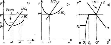 При цене Р* фирмы, характеризующиеся более низкими издержками, полу чают чистую экономическую прибыль (я > 0), что изображено с помощью прямоугольника Р*АВС (рис. 8.8, а). Эта «прибыль» не является временной (площади плодородных земель абсолютно ограниченны, и не каждый желаю щий может их приобрести либо — что то же самое — отсутствуют потенциальные производители, обладающие особыми производственными преимуществами, которые могли бы войти в отрасль). Поэтому отрасль пребывает в долговременном равновесии.