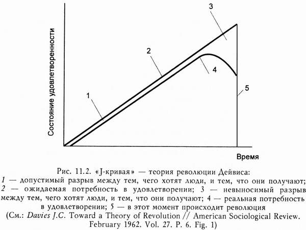 Социолог Джеймс Дейвис обнаружил, что развитию ощущения относительной депривации могут способствовать и другие условия (см. рис. 11.2). По его мнению, революции с наибольшей вероятностью вспыхивают после продолжительного периода социальных и экономических улучшений, за которым следует период резкого отката назад. Люди опасаются потерять то, чего им с таким трудом удалось достигнуть, и приобретают революционный настрой. Дейвис иллюстрирует свою гипотезу о “подъеме-и-падении” разнообразными фактами, такими, как бунт на предприятии Дорра на Род-Айленде в 1842 г., стачка рабочих пульмановского завода в 1849 г., русская революция 1917 г. и революция в Египте в 1953 г.
