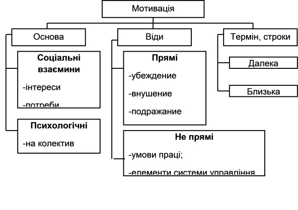 Психологічна мотивація припускає вплив на колектив і окрему особистість з метою активізації трудової і суспільної діяльності. Розрізняють непрямі і прямі види мотивації. При непрямій мотивації застосовують маніпуляторні методи. З їхньою допомогою створюють визначену (заплановану) ситуацію, що дозволяє працівнику чи групі виконати нову роботу в режимі повсякденної організації праці. До прямих видів мотивації відносяться :