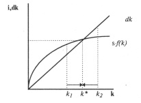 В исходном состоянии экономика имела устойчивый запас капитала k1*, при котором инвестиции равнялись выбытию. После повышения нормы сбережения инвестиции выросли на (i?1 – i1), а запас капитала (k1*) и выбытие (dk1) остались прежними. В этих условиях инвестиции начинают превышать выбытие, что вызывает рост запаса капитала до уровня нового равновесия k2*, которое характеризуется более высокими значениями фондовооруженности и производительности труда (выпуск на одного занятого, у).