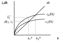 Норма накопления (сбережения) непосредственно влияет на устойчивый уровень фондовооруженности. Рост нормы сбережения с s1 до s2 сдвигает кривую инвестиций вверх из положения s1 ?(k) до s2(k) (рис. 12.3).