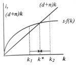 Предположим, население растёт с постоянным темпом n. Это новый фактор, влияющий вместе с инвестициями и выбытием на фондовооруженность. Теперь уравнение, показывающее изменение запаса капитала на одного работника, будет выглядеть как: ?k=i-dk-nk или ?k=i-(d+n)k.