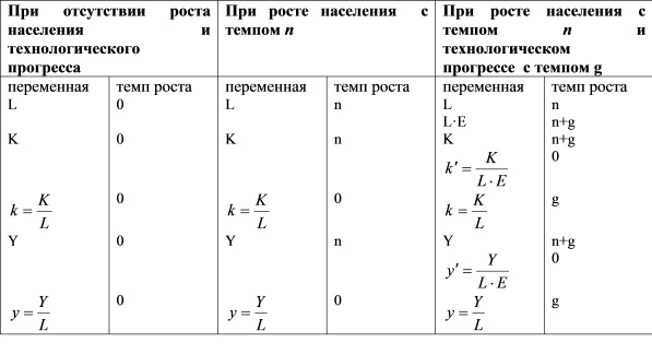 Для дальнейшего развития модели Солоу поочередно снимаются две предпосылки: неизменность численности населения и его занятой части (их динамика предполагается одинаковой) и отсутствие технического прогресса.