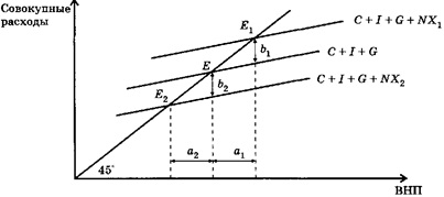 Объем производства ОЕ - это равновесный объем в условиях закрытой экономики. График показывает, что положительный чистый экспорт (NХ1) сдвигает вверх кривую совокупных расходов и равновесие устанавливается в точке Е1, соответствующей более высокому равновесному уровню национального производства. Отрицательный (NХ2) действует с противоположным эффектом. Он снижает совокупные расходы, которым соответствует меньшее значение равновесного национального продукта (E2).