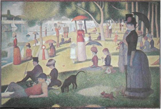 392. Жорж Сера. «Воскресная прогулка в Гранд-Жатт». 1884—86 г. Холст, масло. 2,06 х 3,05 м. Институт искусств. Чикаго. (Собрание, посвященное памяти Элен Бэтч Бартлетт)