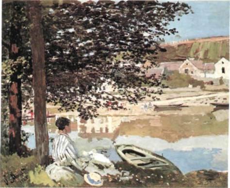 Моне и импрессионизм. Термин «импресси онизм» родился в 1874 году, после того, как один из насмешливо настроенных критиков ознакомился с картиной Клода Моне (1840—1926), носившей название «Впечатление. Восход солнца», и к Моне этот термин, несомненно, подходит больше, чем к Мане. Моне усвоил взгляд Мане на живопись и следовал ему в своих пейзажах, написанных на открытом воздухе. Созданная им в 1868 году кар тина «Река» (илл. 370) залита таким ярким со лнечным светом, что консервативные критики жа ловались, будто она слепит им глаза. В этой пе реливающейся игре цветовых пятен отражения в воде 'кажутся такими же «реальными», как и берега Сены. К картине Моне с еще большим основанием, чем к «Флейтисту» подходит сравнение с «игральной картой». Не будь на переднем плане женской фигуры и лодки, картину с не меньшим успехом можно было бы повесить вверх ногами. Роль отражений здесь совсем иная, чем в работах старых мастеров (сравн. илл. 195): вместо того, чтобы усиливать иллюзию подлинного пространст ва, они помогают создать ощущение единства за крашенной поверхности. Эта внутренняя связь де лает «Реку» непохожей на «впечатления» времен романтизма, например такие, как «Папиньо» Коро (см. илл. 345), хотя и в той, и в другой картине передан непосредственно наблюдаемый момент и чувствуется одинаковая свежесть восприятия.