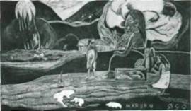 396. Поль Гоген. «Приношение благодарности (Маруру)». Ок. 1891—93 г. Резьба по дереву. Черно-белый оттиск. 20,4 х 35,5 см. Музей современного искусства Нью-Йорк. Собрание Лилли П. Блисс