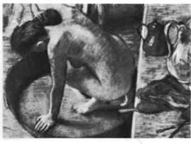 «Купанье в тазу» (илл. 373), написанное де сятью годами позже, тоже подается, как вид сбоку, но композиция здесь более строгая, почти геомет рическая. Энергично прорисованные фигура жен щины и таз образуют круг, вписанный в квадрат. Остальное пространство прямоугольника занимает полка, изображенная под таким углом, что она как бы разрезает плоскость картины на две части. Однако на этой полке Дега поместил два почти не уменьшенных в ракурсе кувшина (обратим внимание на то, как форма одного из них соответствует форме ручки другого). В этой картине напряжение, возникающее от противопоставления «двухмерной» поверхности и «трехмерной» глубины достигает наивысшей точки. «Купание в тазу» можно отнести к импрессионизму только благодаря трепещущей, светящейся игре красок. По остальным своим приемам эта картина скорей характерна для восьмидесятых годов XIX века — первой декады импрессионизма, когда многими художниками вновь овладел повышенный интерес к проблемам формы (см. ел. главу).