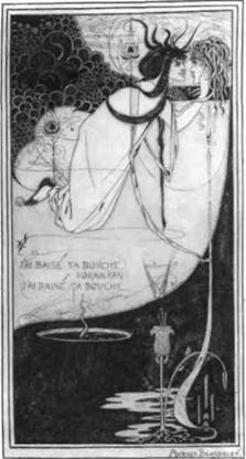 Бердслей. Творчество Моро пророчески пред восхитило стиль, которому суждено было господ ствовать в конце века, что наглядно подтверждают работы Обри Бердслея (1872—1898) — талантливого молодого англичанина, чьи черно-белые рисунки стали образцом вкусов того времени. Среди них можно назвать иллюстрацию к «Саломее» Оскара Уайльда (илл. 398), которую легко принять за последний акт драмы, изображенной Моро: взяв в руки отрубленную голову Крестителя, Саломея тор жествующе целует ее. Эротический смысл трак товки Бердслея ясен: Саломея страстно влюблена в Иоанна Крестителя и потребовала его голову, так как иначе завладеть им не могла. Замысел же Моро можно толковать по-разному. Возможно, его Саломея сама вызвала явление головы Крестителя; но влюблена ли она в него? Тем не менее, сходство двух работ поразительно, не говоря уже и о перекличке формальных деталей, это, в частности, струя крови, образующая нечто вроде стебля, который, словно цветок, венчает голова Иоанна. Нельзя сказать, что «Саломея» Бердслея заимст вована у Моро. Стиль Бердслея имеет английские источники, прежде всего, творчество прерафаэлитов (см. илл. 377), а кроме того на него оказало большое влияние японское искусство.