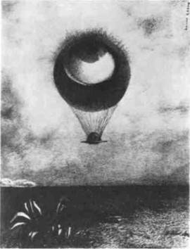 Редона не являются иллюстрацией к произведениям По. Скорее это «рисованные поэмы», по-своему трактующие зловещий, сотканный из галлюцинаций мир, рожденный воображением По. На приведенной здесь литографии художник обратился к древней эмблеме — глазу, символизирующему всевидящее око Господне. Но в отличие от традиционных изображений этого символа Редон показывает нам глазное яблоко, вынутое из глазницы и превращенное в воздушный шар, который бесцель но парит в небесах. В нашем столетии к подобным трудновоспринимаемым парадоксам с увлечением обратятся дадаисты и сюрреалисты (см. илл. 430 и 437).