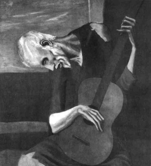 Голубой период Пикассо. Воздействие той же художественной атмосферы, которая вызвала к жизни манеру Мунка, сказалось и на Пабло Пикассо (1881—1974), приехавшего в Париж в 1900 году. В его работах, относящихся к так называемому «голубому периоду» (этот термин связан с превалирующим в его картинах цветом, а также с их настроением), мы видим почти одни только отбросы и жертвы общества — нищих, бродяг и других отщепенцев, пафос же этих холстов отражает состояние души художника, сознающего свою изолированность. И тем не менее, в образах, на селяющих полотна этого периода, в таких, напри мер, как «Старик-гитарист» (илл. 402), ощущается скорее не отчаяние, а поэтическая грусть. Соста рившийся музыкант принимает свою участь с кро тостью чуть ли не святого, а грация его исхудалого тела напоминает полотна Эль Греко (сравн. илл. 248). «Старик-гитарист» представляет собой стран ную смесь маньеризма и заимствований у Тулуз Лотрека и Гогена, приправленную меланхолическим настроением самого двадцатидвухлетнего гения.