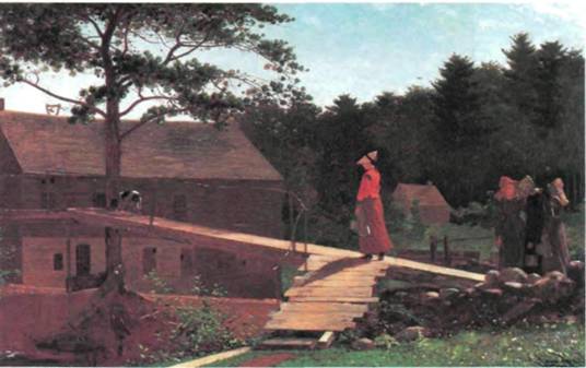 Хомер. Талантливый соотечественник Уистлера Уинслоу Хомер (1836—1910) тоже в молодости по бывал в Париже, но провел там слишком мало времени и не успел полностью испытать на себе влияние импрессионизма. Во время гражданской войны в Америке он был художником-репортером и до 1875 года работал иллюстратором в журнале, но при этом заметно проявил себя и в живописи. Его картину «Утренний колокол» (илл. 381), залитую солнцем и написанную свежо и тонко, можно назвать «предимпрессионистской». По манере она является чем-то средним между Коро и Моне (сравн. илл. 345, 370). При этом ее отличает удивительно искусная композиция. Собака, девушка и фигуры справа размещены таким образом, что помост воспринимается, как детская доска для качания, наклон которой уравновешивается под нимающейся вверх линией верхушек деревьев. В то же время наклонный помост подчеркивает не желание бредущей по нему девушки идти на мель ницу, где ей предстоит провести весь день. Это нежелание выражено и в позе собаки. Картина может служить документальной иллюстрацией к начальному периоду промышленной революции, когда еще не были приняты законы о детском труде, и молодых людей часто использовали на непосильной работе по многу часов.