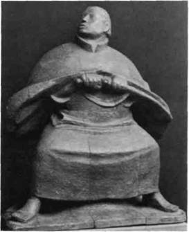 Барлах. Совершенно иных взглядов на скуль птуру придерживался выдающийся немецкий скульптор Эрнст Барлах (1870—1938), чье творчес тво достигло зрелости перед Первой мировой во йной. Он является «готическим примитивистом». Безыскусную наивность доиндустриального века, которую Гоген обрел в Бретани и в тропиках, Барлах нашел в России. Его статуи, например «Человек, вынимающий меч из ножен» (илл. 406), олицетворяют простейшие чувства — гнев, страх, горе — которые, по всей вероятности, пробуждает в изображенных кто-то, кого мы не видим. Если герои Барлаха действуют, они действуют безотчетно, подобно сомнамбулам. Для Барлаха люди — жалкие созданья, зависящие от неподвластных им сил, они не способны противостоять своей судьбе. Характерно, что изображаемые Барлахом фигуры обычно не отделяются полностью от того матери ала, из которого они сделаны (например, «Выни мающий меч» — от массивного куска дерева). Их одеяния подобны твердой куколке бабочки, они, как в средневековой скульптуре, скрывают живое тело. Творения Барлаха, исполненные немой силы, надолго остаются в памяти.
