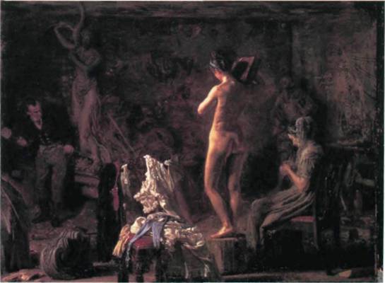 Икинс. Томас Икинс (1844—1916) приехал в Париж из Филадельфии примерно тогда, когда Хомер написал свой «Утренний колокол». Четырьмя годами позже, пройдя традиционное академическое обучение и став убежденным поклонником Курбе и Веласкеса, он вернулся в Америку. Элементы стилей, присущих этим художникам, сочетаются в его работе «Уильям Раш, вырезающий из дерева аллегорическую скульптуру реки Скулкилл» (илл. 382; сравн. илл. 366 и 285). В Пенсильванской Академии художеств стремление Икинса изобра жать повседневную жизнь встретило упорное со противление. Для него скульптор Раш был героем, так как тот в 1809 году отважился создать статую для Филадельфийской водопроводной станции с обнаженной натуры, хотя сама статуя и была облачена в классический плащ. Икинс, несомненно, знал картины современных ему европейских жи вописцев, изображавших скульпторов, работающих с обнаженными натурщицами, в то время история Пигмалиона и Галатеи пользовалась популярностью в среде академических художников. Консерватив ные критики осудили картину Икинса за изобра жение обнаженной натуры, хотя натурщица пози рует скульптору в присутствии пожилой компань онки, мирно вяжущей в углу справа. Как бы там ни было, для нас эта картина, декларирующая откровенную правду, служит неудачным откликом на призыв Бодлера, требовавшего, чтобы живопись отражала героизм повседневной жизни.