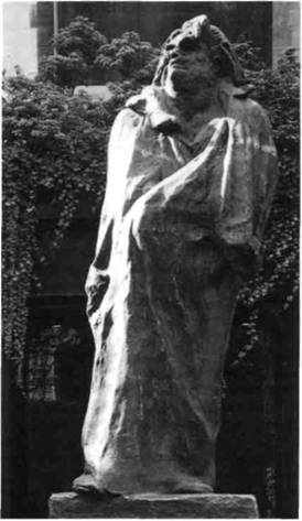385. Огюст Роден. «Памятник Бальзаку». Бронзовая отливка. Высота 2,82 м. Музей память о Курте Валентине его друзьямиНо Роден от природы был лепщик и не работал с камнем, как Микеланджело. Каждая из его лучших скульптур создавалась для отливки в брон зе, однако всю их мощь можно оценить только рассматривая гипсовые слепки, сделанные с гли няных оригиналов Родена. Самое дерзкое творение Родена — «Памятник Бальзаку» (илл. 385) — до лгие годы оставалось выполненным в гипсе, так как скульптура не удовлетворила комитет, заказавший памятник. Фигура Бальзака и по физическим, и по духовным меркам крупней человеческих масштабов. В ней есть что-то от наводящего страх призрака: гениальный писатель, словно гигантский монолит, возвышается над толпой. Ему сродни «высокомерный эготизм богов» (как выражались романтики). Роден постарался свести на нет анатомические детали фигуры, так что издали мы видим только грандиозную глыбу. Но по мере приближения начинаем понимать, что Бальзак за кутан в длинный, похожий на саван, плащ. Эту глыбу венчает голова, вздернутая, хочется даже сказать — взметнувшаяся — с какой-то стихийной энергией. Подойдя совсем близко, так что можно различить черты лица, мы понимаем: за выраже нием высокомерия кроется душевное отчаяние, и это ставит Бальзака в один ряд с «Мыслителем».