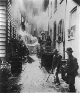 Рийс. Применение магниевой вспышки, изо бретенной через десять лет, дало возможность Якобу Рийсу (1845—1914) использовать при съемках эффект неожиданности. Рийс был полицейским репортером в Нью-Йорке и мог из первых рук получать сведения о жизни трущоб, населенных преступными элементами, и об ужасающих усло виях существования их обитателей. Он вел неус танную кампанию со страниц газет, публиковал книги, выступал с лекциями и в ряде случаев ему удавалось добиться пересмотра жилищных кодексов и законов о труде. Беспощадная правдивость его фотографий продолжает впечатлять до сих пор. Трудно представить себе более устрашающую сцену, чем его «Гнездо бандитов» (илл. 410). Мы явственно чувствуем, как зловеще дышит опасностью залитая призрачным светом улица. Знаменитые банды преступников в Лоуэр Ист сайд Нью-Йорка по ночам выслеживали свои жертвы и без колебаний убивали их. Так и кажется, что неподвижные фигуры на снимке изучают нас наметанным взглядом, хладнокровно оценивая потенциальную добычу.