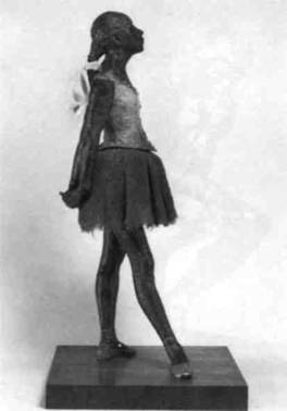 меньшая по размеру обнаженная фигурка, выпол ненная с натуры, которая явилась прообразом «Че тырнадцатилетней танцовщицы». Дега не стал ле пить ее костюм, он использовал настоящий шелк и газ, что для того времени было революционным решением, хотя романтиков, всегда тяготевших к натурализму, такая возможность, вероятно, при влекала часто. Нескладность девочки-подростка ис кусно подчеркнута ее позой, она стоит в класси ческой балетной позиции, но для зрителя эта поза необычна. И все же танцовщица не кажется не уклюжей, от статуи веет наивным достоинством, она исполнена чарующей грации. Безыскусность позы — руки, сомкнутые за спиной, ноги, развер нутые в разные стороны — принуждают зрителя обойти статуэтку вокруг, чтобы составить о ней полное представление. А при разглядывании тан цовщицы с разных точек зрения бросается в глаза постоянно меняющаяся игра света на поверхности скульптуры, сродни той, что мы видели на мно жестве живописных и пастельных работах Дега, посвященных балету.