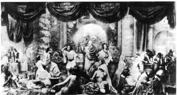 Рейландер. Этим требованиям отвечает фото композиция Оскара Рейландера (1818—1875) «Два жизненных пути» (илл. 411), являющая собой ал легорию, явно восходящую к «Карьере мота» Хо гарта (см. илл. 317). Эта ловко смонтированная фотография шириной почти три фута состоит из тридцати негативов, соединенных с помощью ком позитной печати. На фотографии представлен в двух изображениях молодой человек, которому предстоит сделать выбор между стезей добродетели и стезей порока. Последнюю символизируют пол дюжины обнаженных натурщиц. Фотография, вы ставленная в 1857 году произвела сенсацию, и один из отпечатков приобрела сама королева Виктория. Однако Рейландеру не довелось еще раз пережить подобный успех. Он был самым предприимчивым фотографом своего времени и вскоре обратился к другим сюжетам, но они уже меньше отвечали тогдашнему общественному вкусу.