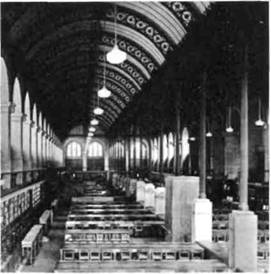 Лабруст. Одним из самых ранних и ярких образцов такого стиля является здание библиотеки Святой Женевьевы в Париже архитектора Лабруста (1801—1875). Внешний вид здания отдает дань ис торизму, который был характерен для середины XIX века (илл. 387). Этот стиль опирается, главным образом, на архитектурную манеру итальянского Ренессанса, в которой строились банки, библиотеки и церкви. Для обозначения того, что здание яв ляется библиотекой, Лабруст использовал простой, но остроумный прием — на фасаде начертаны имена великих писателей. Читальный же зал (илл. 388), напротив, напоминает неф французского готического собора (ср. илл. 155). Почему Лабруст использовал здесь чугунные колонны и арки, при менявшиеся до тех пор только при строительстве железнодорожных вокзалов? Чугун понадобился ему не для того, чтобы обеспечить мощную поддержку двойного цилиндрического свода, он мог бы обой тись и другими строительными материалами, но чугун требовался для воплощения символической программы Лабруста. Архитектор дает нам понять, что и библиотека является складом — хранилищем чего-то даже более важного и более дорогого, чем материальные ценности, в ней содержатся сокро вища мировой литературы, дающие возможность унестись в дальние странствия не по неизведанным местам, а по лабиринтам духа.