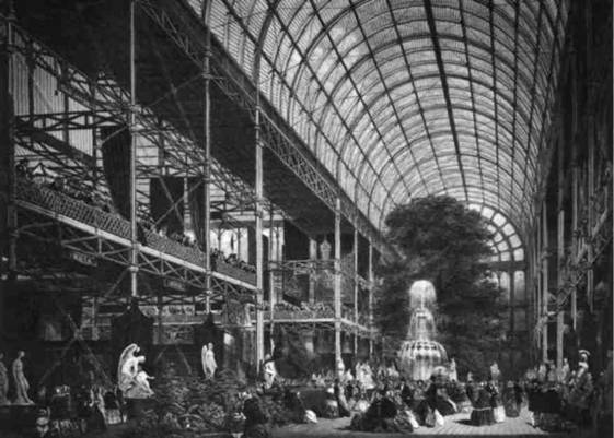 Для создания собственного современного стиля индустриальной эпохе следовало покончить с гос подством стилей старых, возрожденных. Однако мода на подражание старине оказалась чрезвычайно живучей. «Архитектура безудержного выставления напоказ», облюбованная Гарнье (см. стр. 372), еще менее отвечала нуждам современности, чем прежние стили. Даже Лабруст — пионер в области применения металлических конструкций — и подумать не мог, что кроме колонн с традици онными капителями и основаниями, возможны и другие архитектурные опоры, например металли ческие стержни и трубы (см. стр. 393). Подобные новые строительные материалы и методы могли использоваться только в сооружениях, вообще не являющихся «архитектурными». Таким образом, Хрустальный Дворец Пэкстона стал провозвестни ком будущей архитектуры.