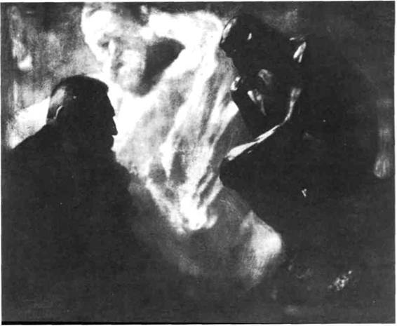 Стейкен. Через Гертруду Кезебир и Альфреда Стиглица «Сомкнутый круг» был тесно связан с Америкой, где в 1905 году в Нью-Йорке Стиглиц открыл галерею «Фотосецессион». Среди подопеч ных Стиглица был молодой Эдвард Стейкен (1875- 1973), чей портрет Родена в мастерской (илл. 414), без сомнения, является высочайшим достижением среди работ группы «Фотосецессион». Эта фотография ярко отражает противоречивые отношения, связывающие творца с его творениями — сидящий в профиль скульптор всматривается в статую «Мыслителя». За насупленной сосредоточенностью Родена прячется внутренняя тревога, внушенная похожей на привидение скульптурой Виктора Гюго, которая, словно оживший гений, драматически воз никает на заднем плане. Со времен «Создания Адама» — творения Микеланджело — любимого художника Родена (см. илл. 233), никому еще не удавалось столь выразительно использовать прост ранство и образ и столь глубоко проникнуть в тайну творчества.