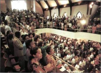 Христианская цер ковь стремительно расширяется в стра нах Азии , Африки и Латинской Америки . Быстрее других рас тет церковь пятидесятников . Фрагмент молитвы в Сеуле , Южная Корея .