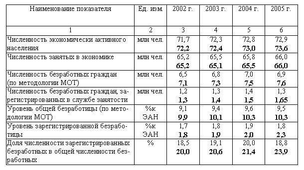 В России экономически активное население в 2002 г. составило 72,2 млн. чел., из них безработных ? 7,1 млн. чел., отсюда официальный уровень безработицы ? 9,0%1.