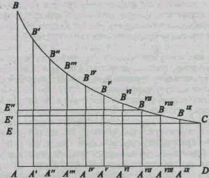 Зная, что площадь AIXBIXCD на рис. 1 означает продукт конечной единицы труда, мы можем быть уверены, что ни одна единица рабочей силы не производит меньше этой величины. Краткое изложение закона конечной производительности может вызвать вопрос, не производят ли прежние единицы труда в данном ряду больше последней; но в том, что они производят столько же, сколько последняя, сомневаться не приходится. AECD, таким образом, является наименьшей величиной, которая может быть отнесена за счет труда как причины ее наличия. Пусть на рис. 2 линия AD служит мерилом капитала вместо труда, пусть величина рабочей силы будет неизменна, а продукт последовательных единиц капитала снижается вдоль кривой ВС. AIXBIXCD, таким образом представляет продукт, производимый последней единицей капитала. Ни одна другая единица капитала не производит меньше ее, и площадь AECD является тем минимумом, который может быть вменен всем десяти единицам капитала.
