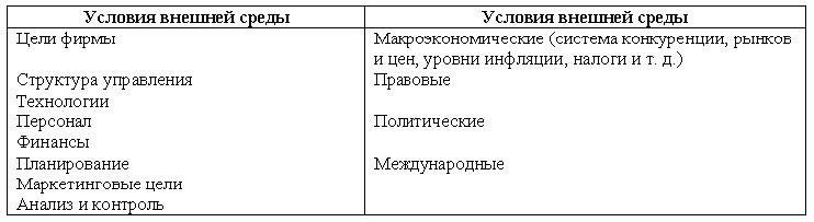 Но есть и внешняя среда ? это макроэкономические условия (система конкуренции, рынков и цен, инфляция, налоги и т. д.), правовые, политические, международные и социальные условия, т. е. те условия, которые фирма сама устанавливать и контролировать не может.