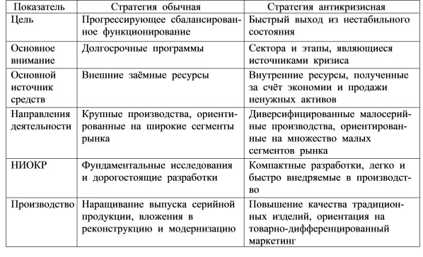 В заключение в таблице 7.1 приведено сравнение обычной и антикризисной стратегий производственного предприятия.