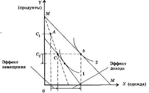 Наш график на рис. 6.6 построен с помощью «кривых безразличия» и кривых бюджетных ограничений, совмещенных так, чтобы показать интересующие нас эффекты. Они отражают одновременные изменения от понижения цен: рост покупательной способности (эффект дохода) и замещение большим количеством подешевевшего товара - меньшего количества тех, чьи цены не менялись (эффект замещения). Первоначальная бюджетная линия соответствует сформировавшемуся потребительскому спросу на два товара (например продукты и одежду). Равновесие установилось в точке А, где произошло касание бюджетной линии и « кривой безразличия - 1». При любом снижении цен эффект дохода сместит вправо вверх всю линию бюджетных ограничений и покупательское равновесие установится на более высоком уровне (в точке В) по касанию кривых бюджетного ограничения и «безразличия - 2». Если произошло снижение цен, например, только на одежду, то линия бюджетных ограничений (пунктирная) «разделит» эффект дохода, указывая величину замещения продуктов с неизменными ценами (по оси Y) на возросшее количество одежды по снизившимся ценам (по оси X). «Кривая безразличия - 3», установившая потребительское равновесие в точке С, покажет общее изменение в потреблении как продукта с неизменной ценой, так и одежды после снижения ее цен. Эффекты дохода и замещения в этом случае суммированы в совокупном эффекте, а величина каждого из них показана отрезками вдоль оси X. Отрезки, «отсекаемые» линией бюджетных ограничений и точками потребительского равновесия, спроецированы на осях продуктов и одежды и соответствуют величине тех изменений в спросе, которые соответствуют эффектам замещения и дохода