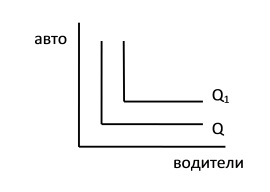 Возможен также вариант, когда два ресурса взаимно дополняют, но не заменяют друг друга. Например, в сфере автомобильных перевозок количество автомобилей и численность шоферов должны быть одинаковыми и неизменными для данного объема перевозок. Изокванта в этом случае будет иметь вид прямого угла (рис. 7.2, б).