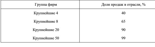 3. Наиболее надежным показателем считается коэффициент рыночной концентрации, определяемый как процент продаж (выпуска продукции, занятости, стоимости, добавленной обработки), приходящийся на определенное количество фирм (обычно 4, 8, 20, 50 фирм).