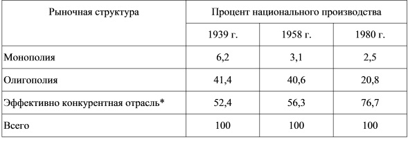 Другой американский экономист - У. Шеферд - исследовал структуру экономики США в целом. Он сделал вывод, что большая часть продукции создается в эффективно конкурентных отраслях (определяемых как отрасли с нормой концентрации ниже 40% , низкими барьерами для вхождения и гибким ценообразованием). Экономика с течением времени становится более конкурентной. 77% продукции было произведено в 1980 г. эффективно конкурентными отраслями по сравнению с 52% в 1939 г. (табл. 9.6).