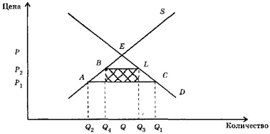 Точка Е на рис. 20.2 и соответствующие ей цена Р и количество Q - равновесные цена и количество на внутреннем рынке на некий товар, при отсутствии внешней торговли. Предположим, что мировая цена на этот товар ниже внутренней - на нашем рисунке ее уровень определяется точкой Р1
