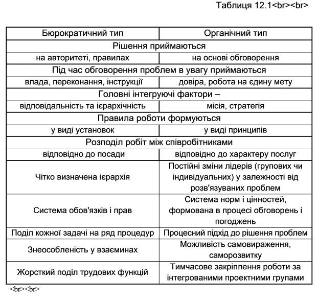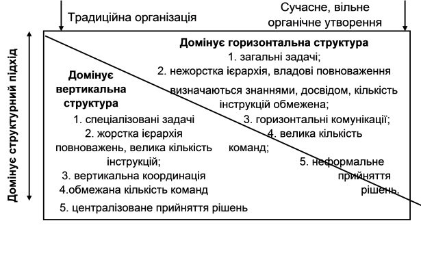 Функція структури управління складається з організації, упорядкування, що необхідні для досягнення цілей організації. Такі елементи структури як командний ланцюг, централізація або децентралізація, власні повноваження, команди та механізм координації формують загальноорганізаційний структурний підхід. Характерні риси, особливості ієрархічної та органічної структури представлені на рис. 12.2.