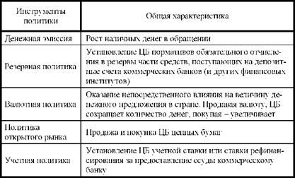 При осуществлении кредитно-денежной политики возможно использование инструментов как прямого (лимиты кредитования, регулирование ставки процента), так и косвенного регулирования (изменение нормы обязательных резервов, изменение ставки рефинансирования, операции на открытом рынке). Эффективность использования косвенных инструментов регулирования тесно связана со степенью развития денежного рынка. Как показывает мировая практика и российский опыт реформирования, в переходных экономиках, особенно на первых этапах преобразований, используются и прямые, и косвенные инструменты с постепенным вытеснением первых вторыми.