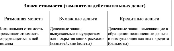 Знаки стоимости - это уже не полноценные деньги, поэтому они не разменны на золото. В настоящее время все страны отошли от золотого содержания денег и перешли к денежным знакам. Знаки стоимости подразделяются на разменную монету, бумажные деньги и кредитные деньги (банкноты) (см. табл. 15.3).