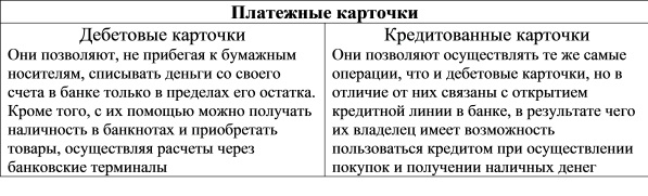 Платежная карточка представляет собой разновидность денежного товара, дающую право его владельцу осуществлять списывание средств с его счета в кредитном учреждении в пределах его остатка либо сверх имеющихся средств на счетах, но в пределах установленных лимитов (табл. 15.4).