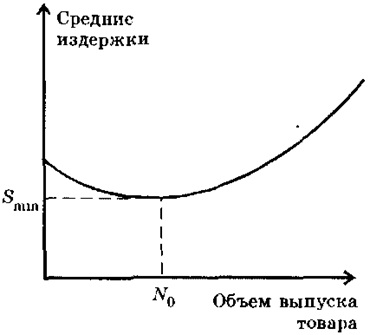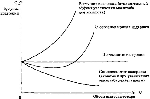 На рис. 11.3 показаны возможные зависимости между средними издержками и объемами выпуска продукции. U-образная кривая средних издержек суммирует свойства, присущие трем остальным кривым затрат, изображенным на том же графике.