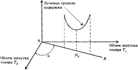 Термин «луч» OR объясняет, почему издержки называются «лучевыми средними издержками». Любая точка луча OR соответствует определенному масштабу деятельности фирмы по товару T1 и товару Т2, но при фиксированной структуре. Поскольку вдоль каждого такого луча динамика средних издержек будет вполне определенной, то точка N0, в которой достигается минимум ЛСИ, соответствует наиболее эффективному масштабу деятельности фирмы при структуре выпуска товаров, определяемой лучом OR. Таким образом, для многотоварной фирмы также характерно наличие эффекта от роста масштаба деятельности и эффекта от расширения номенклатуры производства.