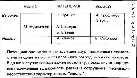 • степени готовности кандидата. Определение степени готовности является наиболее трудным моментом в отборе кандидатов. Часто здесь требуется особое чутье, которое вырабатывается многолетним опытом работы. В качестве вспомогательных инструментов могут использоваться оценки результатов работы и потенциала, часто представляемые в матрице Потенциал-Результаты (см. рис. 30):