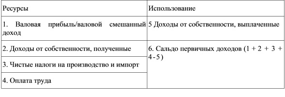 Валовая прибыль, или валовой смешанный доход, сальдирующий показатель в счете образования доходов, а в корреспондирующем счете первичного распределения доходов -ресурсоформирующий показатель (следовательно, в правой его части). Другими показателями ресурсной части счета являются доходы от собственности (полученные), налоги на производство и импорт (налоги на продукты, включая импортную продукцию, и прочие налоги на производство - налоги на факторы производства), оплата труда. Сальдирующий показатель является сальдо первичных доходов и рассчитывается путем вычитания их из суммы ресурсных показателей выплаченных доходов от собственности.