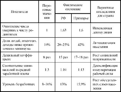Для анализа региональной безопасности в литературе предлагается использовать систему индикаторов, определяющих в виде количественных показателей параметры социальной действительности, несоблюдение которых обусловливает превращение потенциальных угроз нарушения социального равновесия в реальные. Отличительная особенность индикаторов безопасности - их пороговое значение. Приближение к их предельно допустимой величине свидетельствует о нарастании угроз социально-экономической стабильности общества, а превышение предельных, или пороговых значений - о вступлении общества в зону нестабильности и социальных конфликтов, то есть о реальном подрыве экономической безопасности. Рассмотрим значения некоторых социальных индикаторов по России и Приморскому краю (таблица 31).