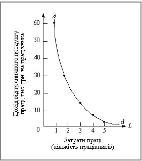 Попит на працю, як і на будь-який інший фактор виробництва, випливає з доходу від граничного продукту праці. Якщо ціна фа- ктора (праці, землі, засобів виробництва) зростає так, як це показано на рис. 9.3, то підприємство, використовуючи правило найменших витрат, попит на цей фактор скорочує, замінюючи його більшою кількістю інших факторів. Якщо, наприклад, ціна одиниці праці зросте від 3 тис. грн. до 50 тис. грн., то попит на працю скоротиться з п’яти робітників до одного; зате зросте попит на інші фактори, що є взаємозамінними.